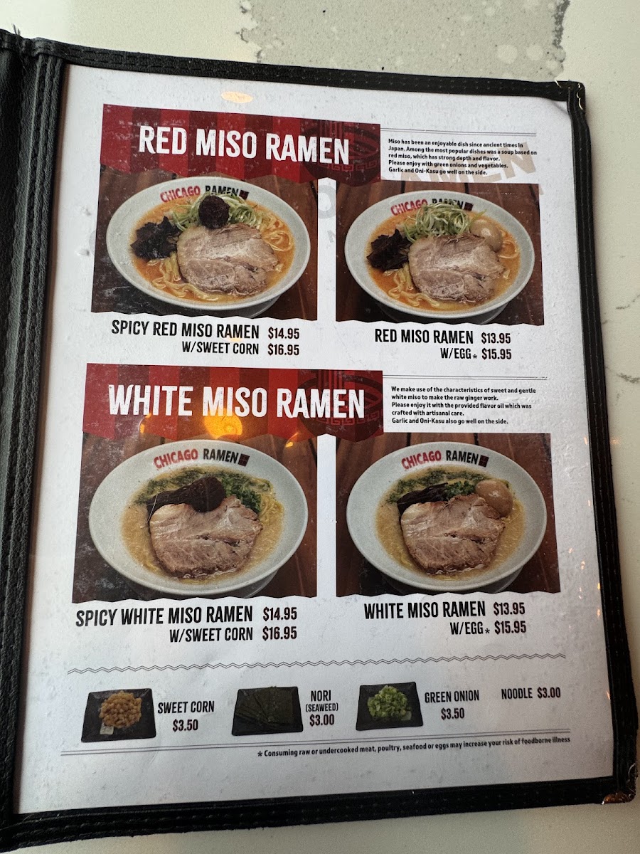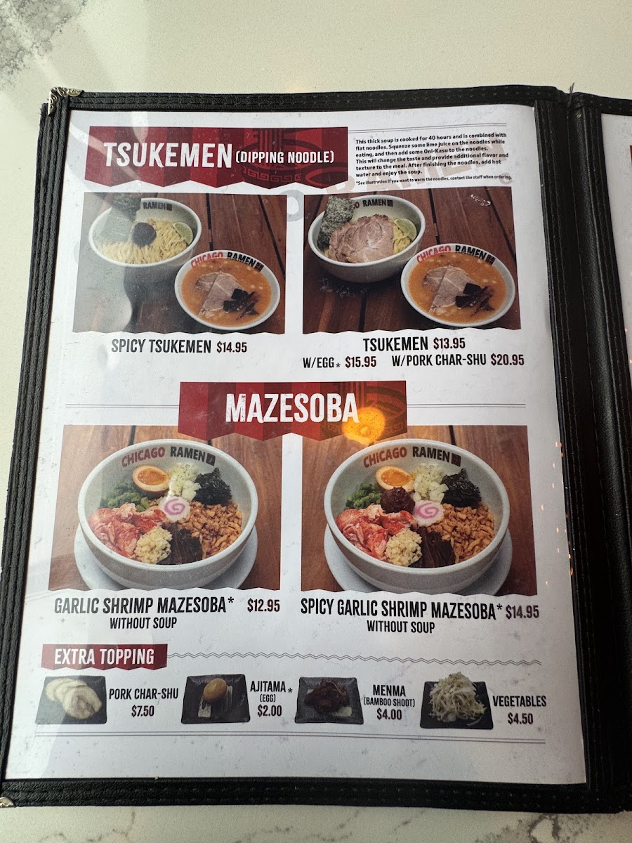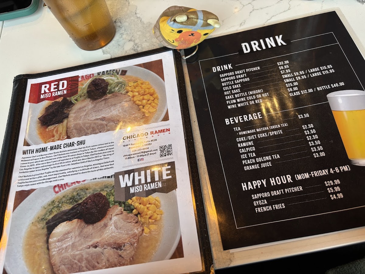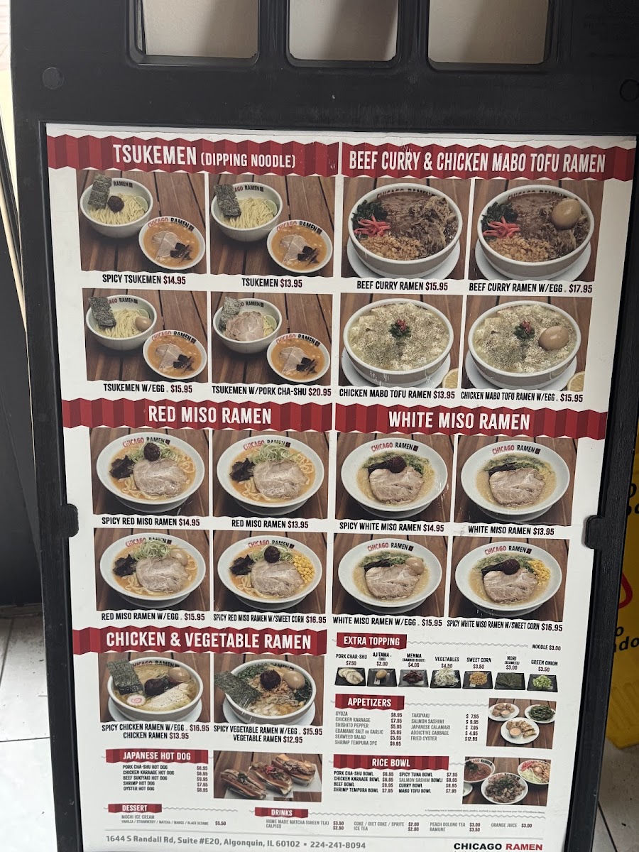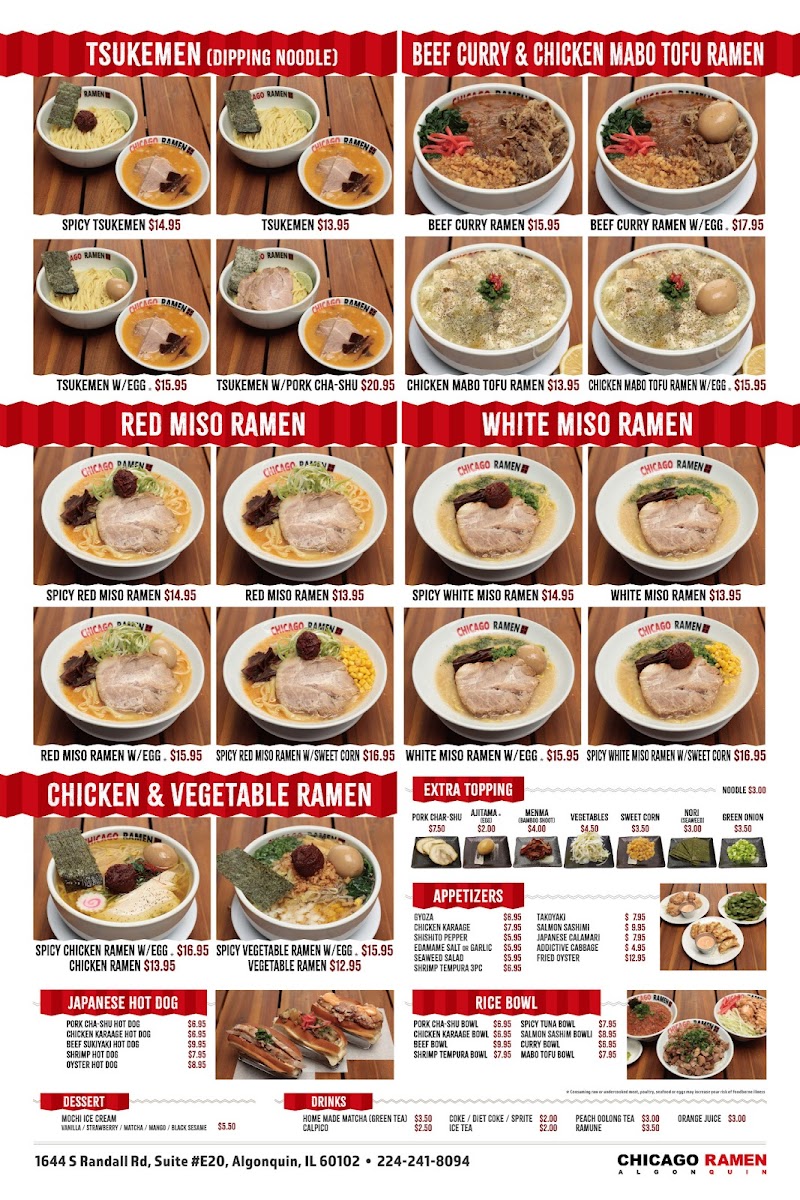 The menu at Chicago Ramen Algonquin offers a delightful selection of comforting bowls that cater to every ramen lover's cravings. Located at 1644 S Randall Rd, Algonquin, IL, this spot brings an exciting fusion of flavors with each dish. Whether you're in the mood for a rich and savory tonkotsu or a lighter, refreshing miso broth, there’s something for everyone. The carefully crafted toppings, from perfectly soft-boiled eggs to melt-in-your-mouth pork, elevate each bowl to new heights. For those looking to add a little spice to their meal, the spicy ramen options will hit the spot, while the signature creations stand out for their unique twists. No matter your preference, Chicago Ramen Algonquin Menu is the perfect place to dive into a delicious, satisfying meal.